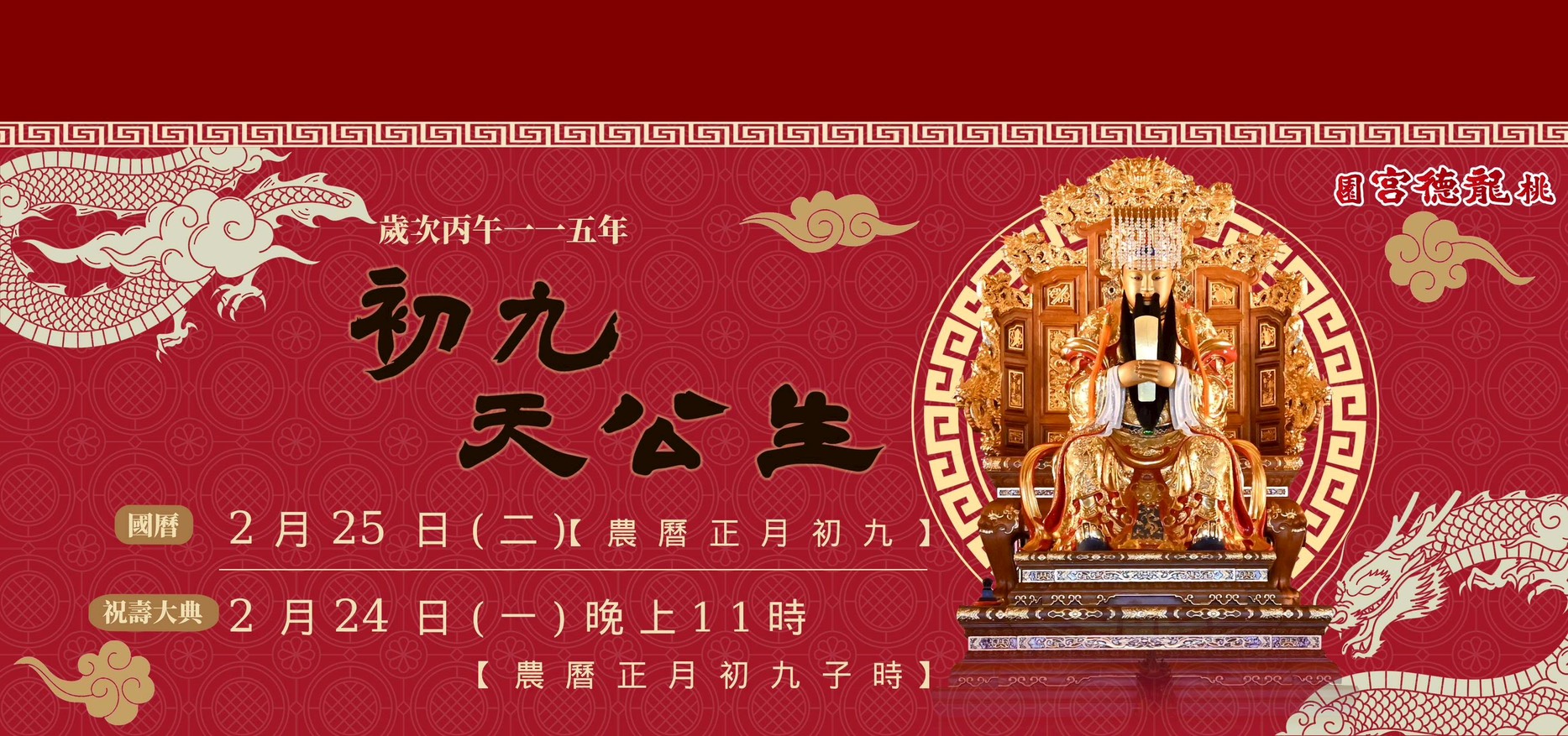 桃園龍德宮將於115年國曆2月24日(星期一)晚上11點(農曆初九子時)舉辦「玉皇大帝」祝壽大典。 […]