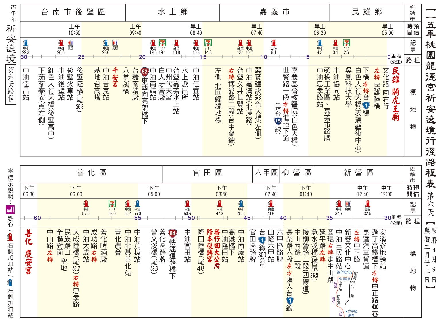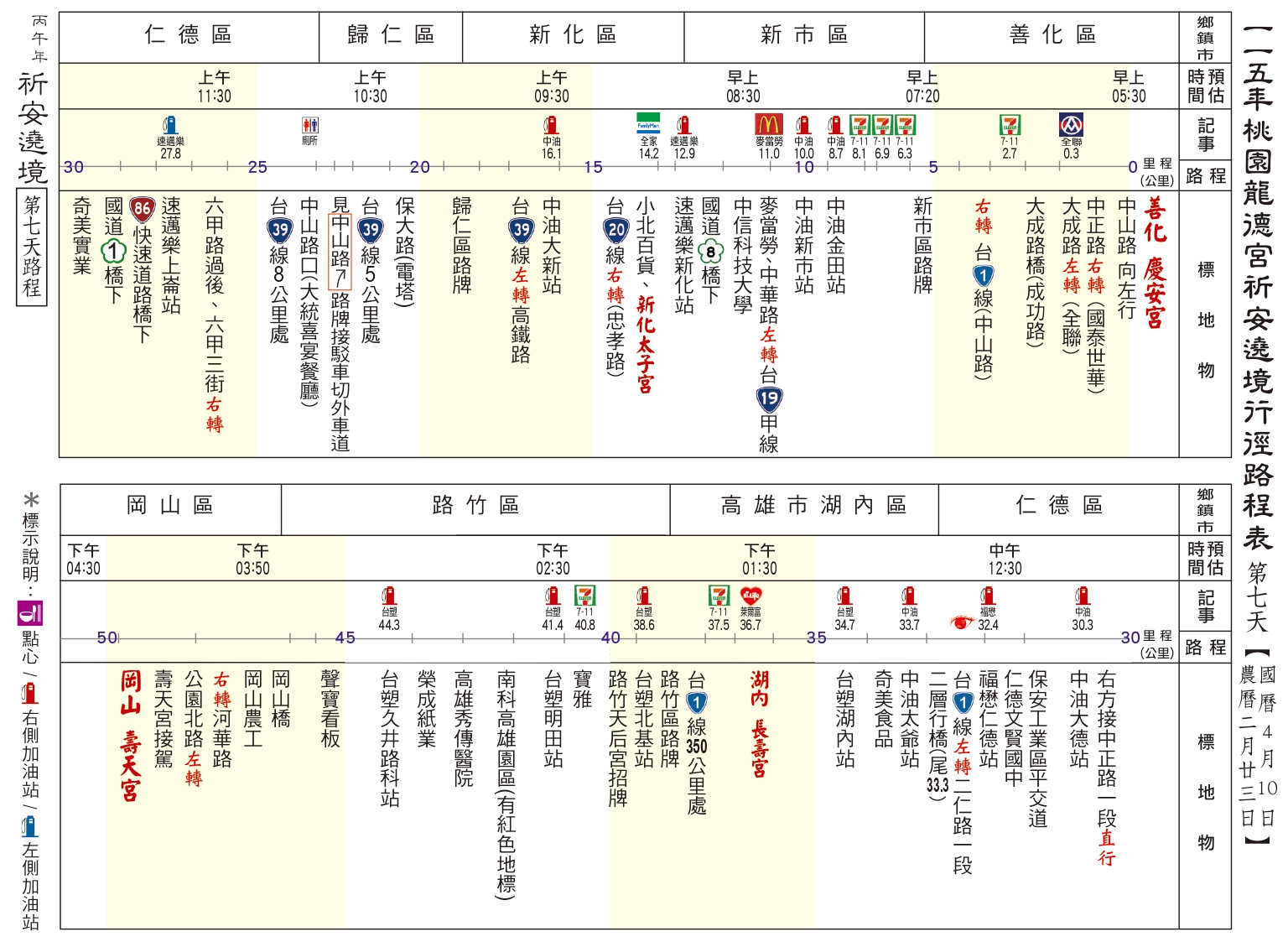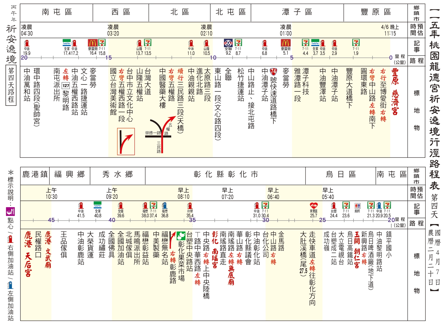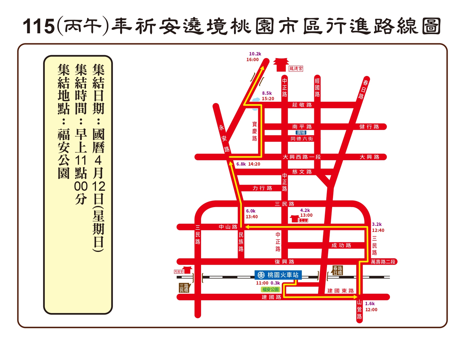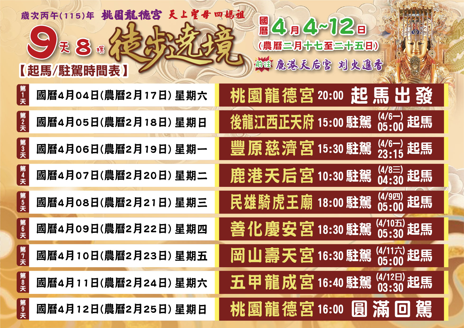丙午(115)年南巡祈安遶境路線圖 發表於 26 3 月, 202626 3 月, 2026 dora0917 ⛩第一、二天:駐駕 後龍江西正天府 ⛩第三天:駐駕 豐原慈濟宮 ⛩第四天:駐駕 鹿港天后宮 ⛩第五天:駐駕 民雄騎虎王廟 ⛩第六天:駐駕 善化慶安宮 ⛩第七天:駐駕 岡山壽天宮 ⛩第八天:駐駕 五甲龍成宮 ⛩第九天:回駕 桃園龍德宮