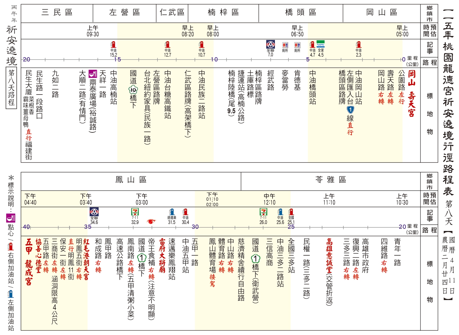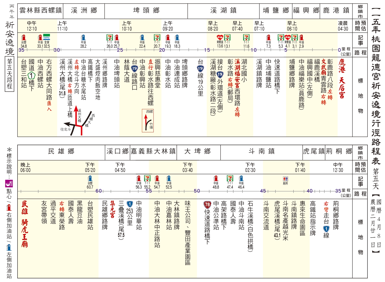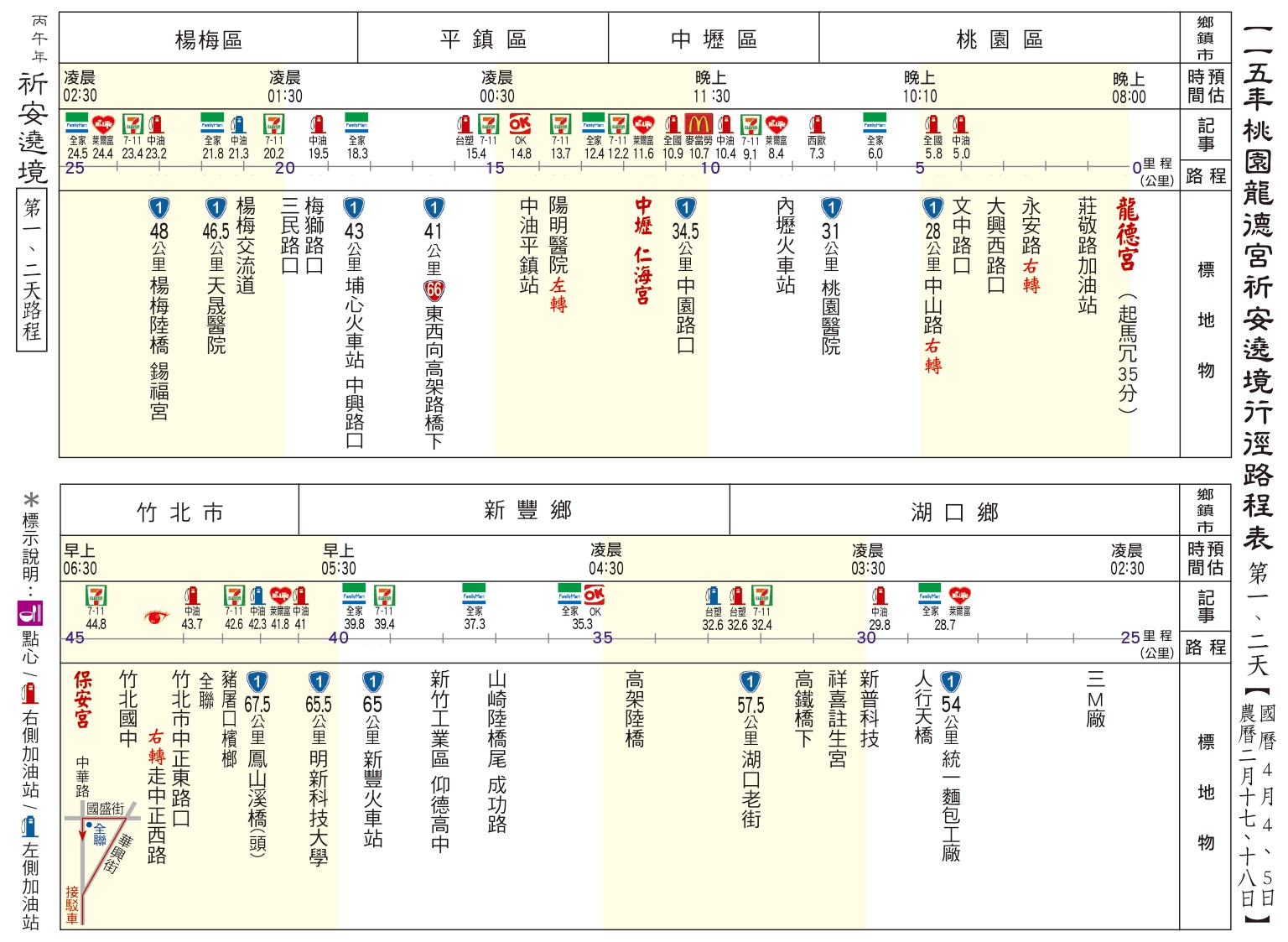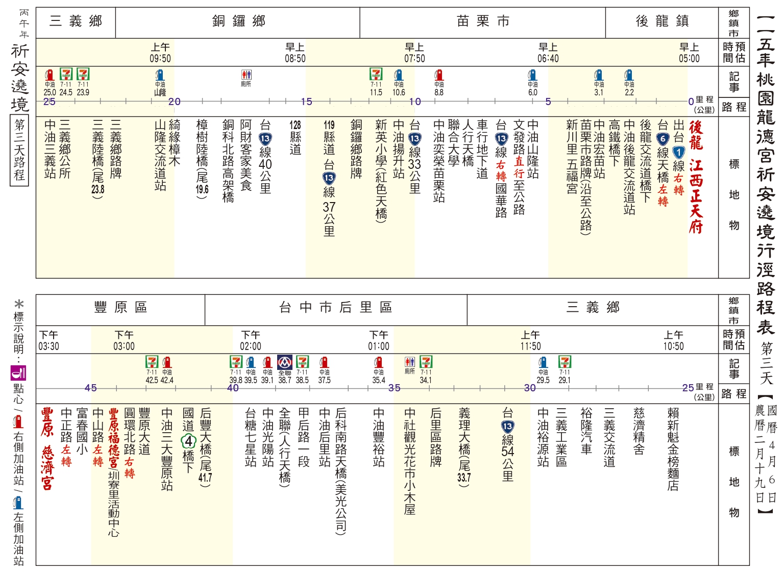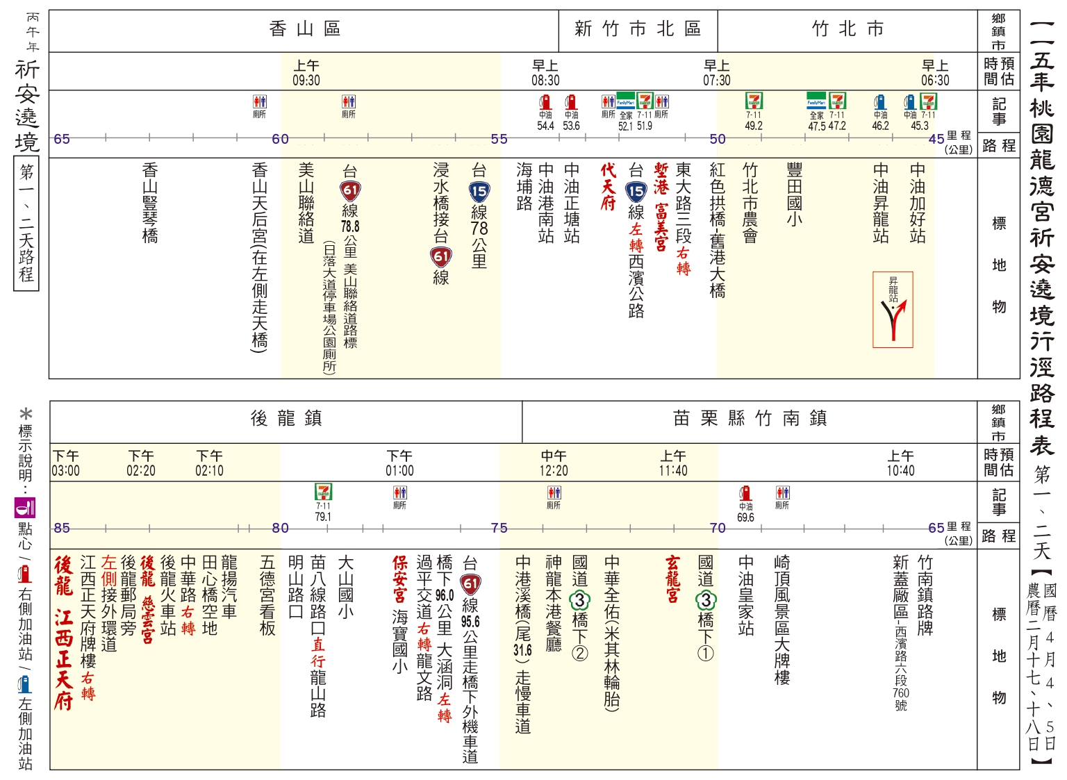 丙午(115)年南巡祈安遶境路線圖 發表於 26 3 月, 202626 3 月, 2026 dora0917 ⛩第一、二天:駐駕 後龍江西正天府 ⛩第三天:駐駕 豐原慈濟宮 ⛩第四天:駐駕 鹿港天后宮 ⛩第五天:駐駕 民雄騎虎王廟 ⛩第六天:駐駕 善化慶安宮 ⛩第七天:駐駕 岡山壽天宮 ⛩第八天:駐駕 五甲龍成宮 ⛩第九天:回駕 桃園龍德宮