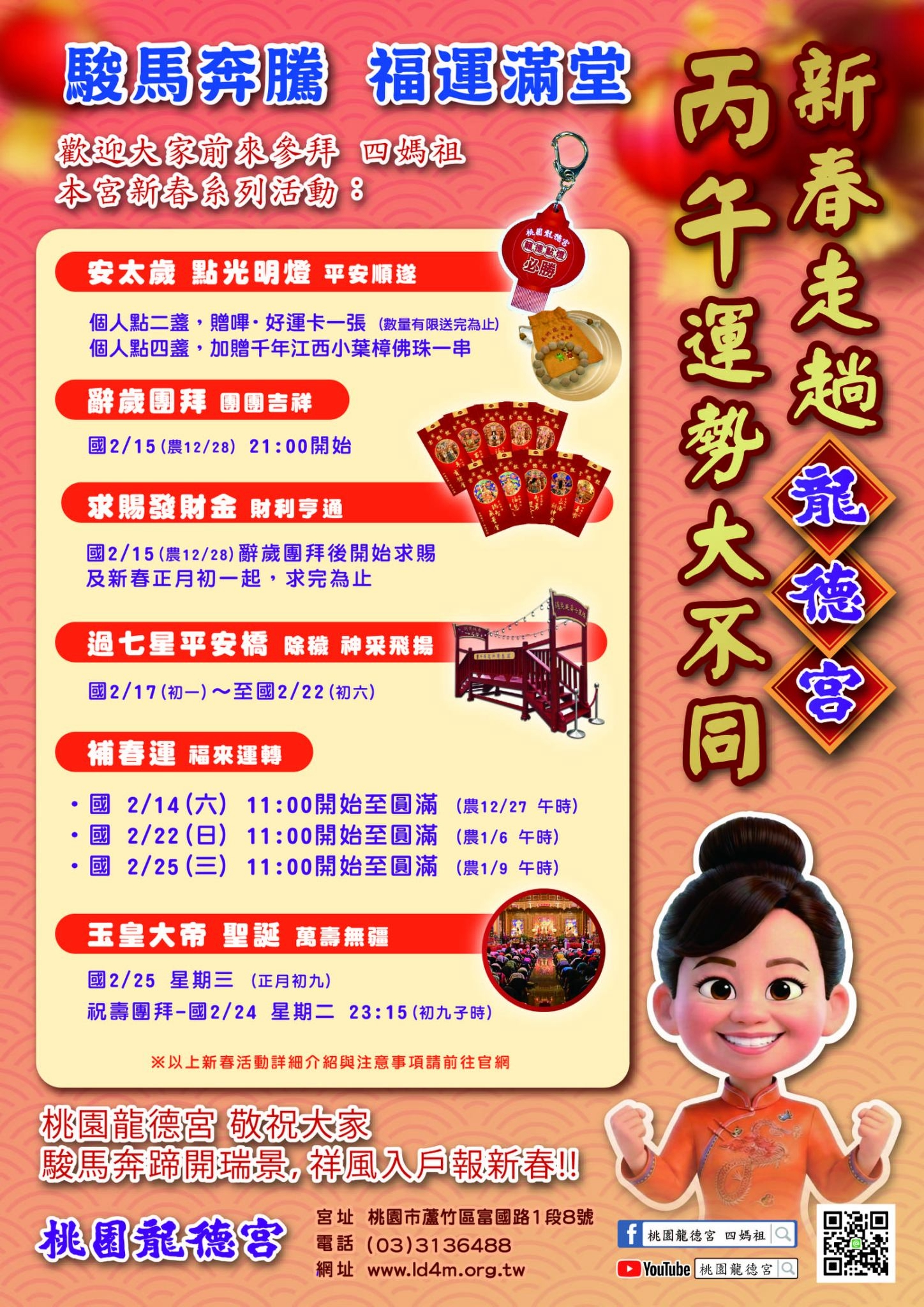 丙午(115)年新春系列活動 發表於 9 1 月, 2026 dora0917 《駿馬奔騰,福運滿堂》🌸新春活動一籮筐🌸 🧧太歲光明 點燈祈福 🧧辭歲團拜 送舊迎新 🧧求發財金 財利亨通 🧧過七星橋 神采飛揚 🧧新春補運 福來運轉 🧧玉皇聖誕 萬壽無疆 春走趟龍德宮,馬年運勢大不同,歡迎大家一起來龍德宮走春! ㊗️您吉星高照、貴人圍繞,喜事天天來報到🎊 詳細活動資訊,請洽服務專線:03-3136488