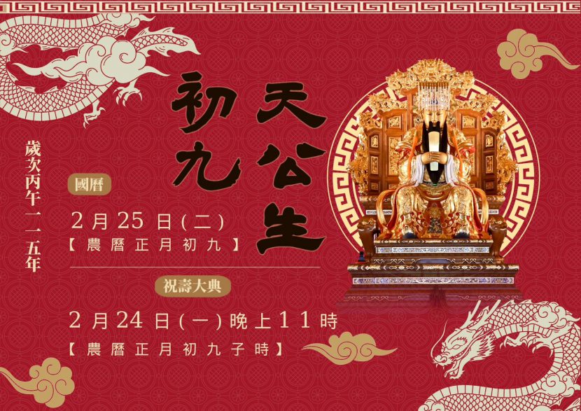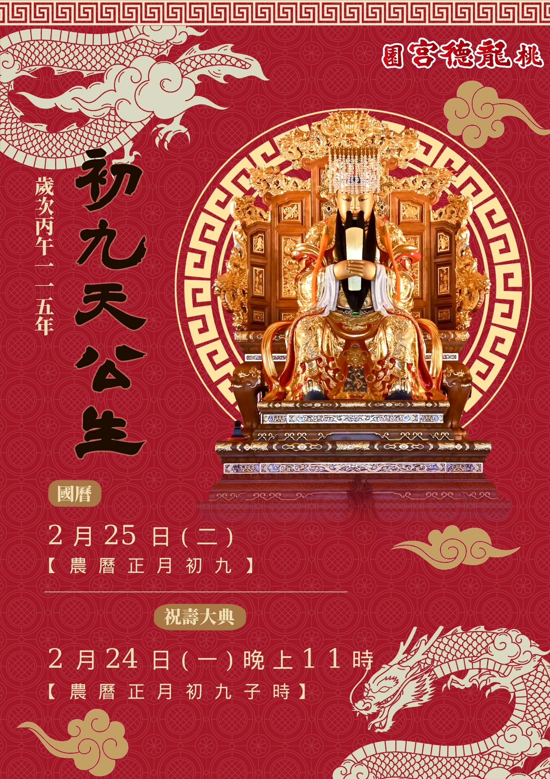 桃園龍德宮將於115年國曆2月24日(星期一)晚上11點(農曆初九子時)舉辦「玉皇大帝」祝壽大典。