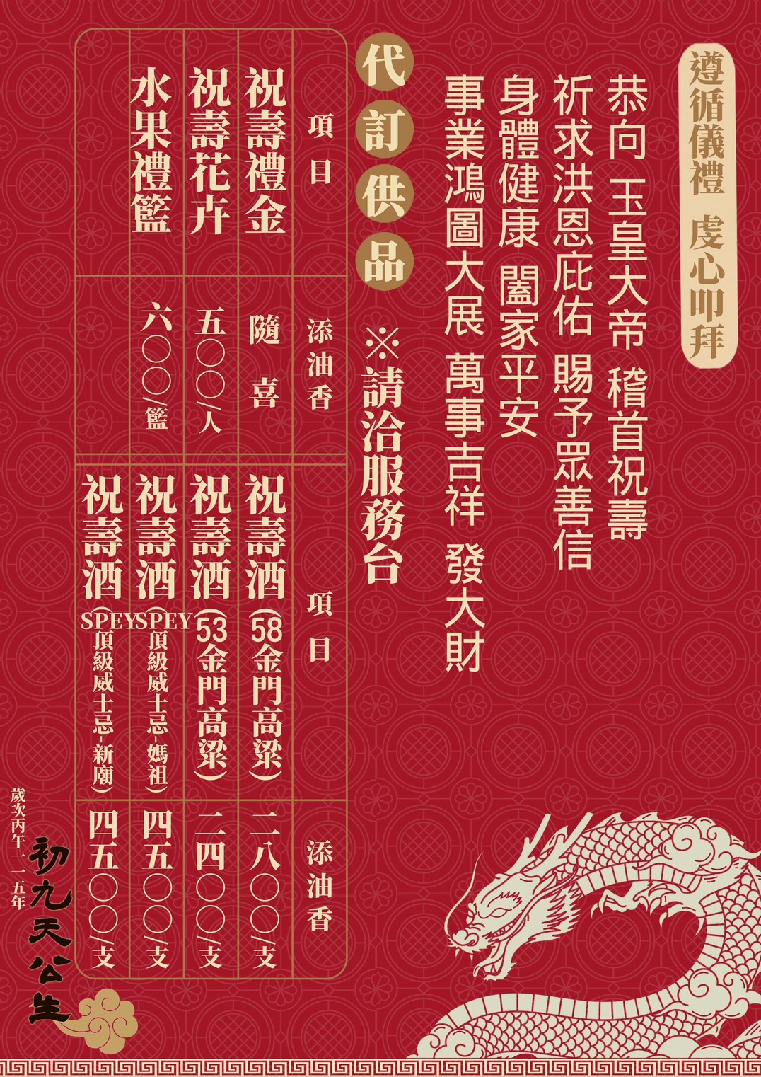 赤霞丹誠,虔心叩拜,恭向 玉皇大帝聖座前稽首祝壽,祈求鴻恩庇佑,眾生所願吉利平安。