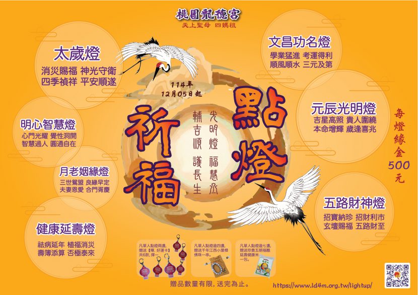 本宮設有太歲燈、光明燈供各位大德點燈,祈求 四季平安、家庭美滿、學業進步、財源廣進、前途光明,歡迎蒞宮登記報名。