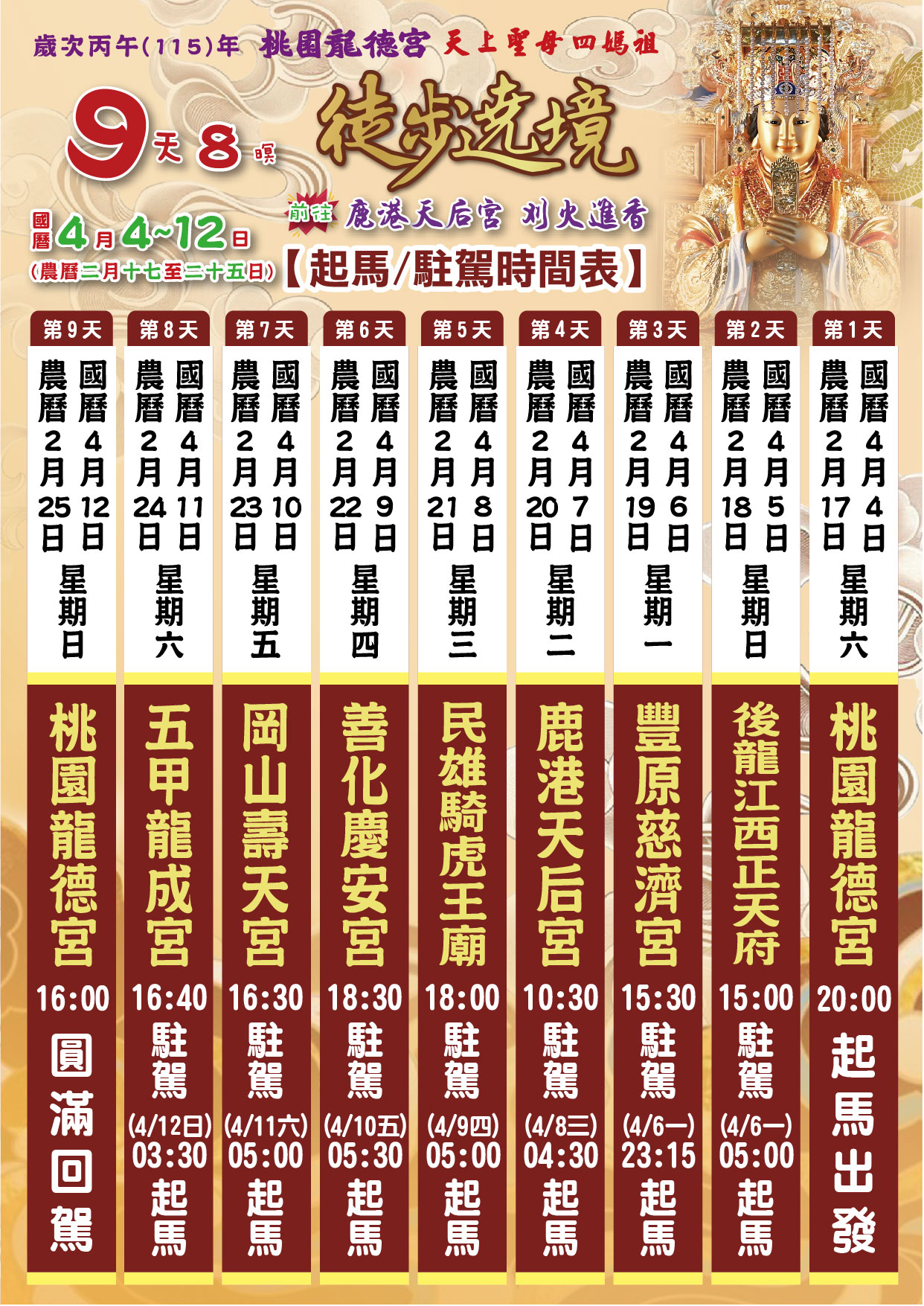 擇定於國曆4月4日至4月12日 徒步前往鹿港天后宮刈火進香