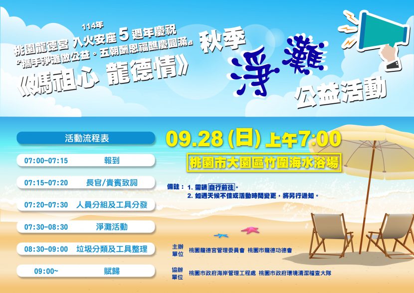 『攜手淨灘做公益.五朝酬恩福醮慶圓滿』 時間:9月28日(星期日)上午7點 地點:桃園市大園區竹圍海 […]